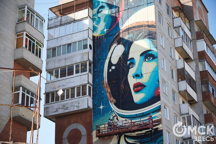 Граффитисты, участвующие в фестивале "Омск, ты просто космос!", не только занимаются искусством в нашем городе, но и создают семьи. Художник из Москвы Василий Родионов недавно закончил рисовать мурал на фасаде дома по ул. Конева, 14/1. Теперь жители Левого берега и все, кто ездит по метромосту, могут любоваться женщиной-космонавтом.