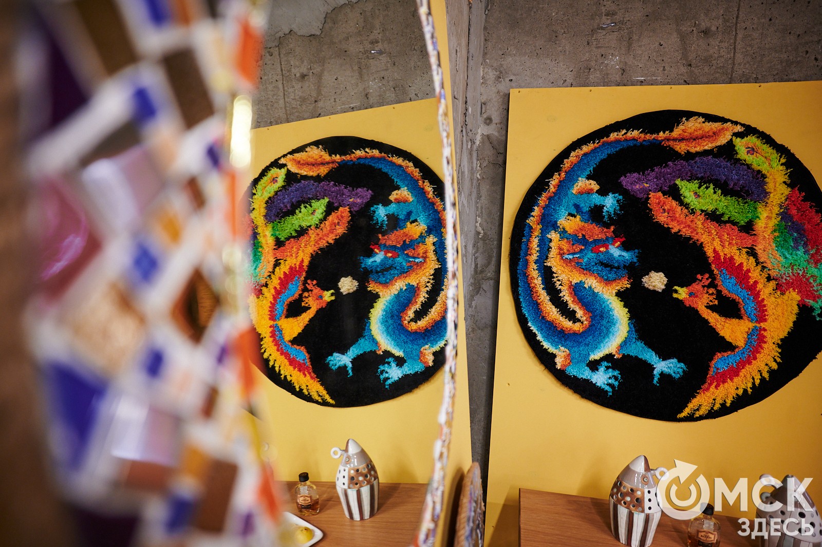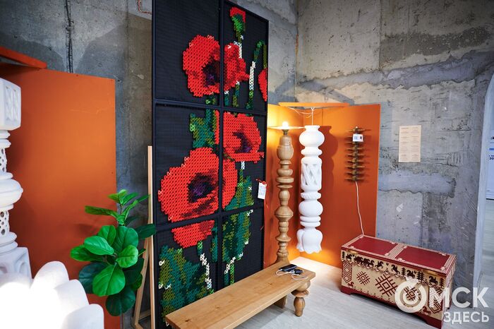 Заяц над волнами Хокусая, противостояние (или же танец) жар-птицы и дракона. Вне конкурса прошла выставка предметов интерьера, созданных омскими мастерами. Среди них яркие текстильные панно, зеркала, тумбы и даже бар на базе столика от швейной машинки "Зингер".