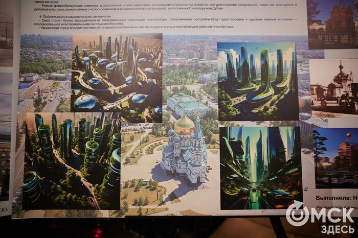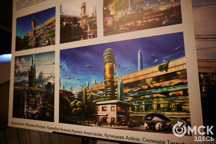 Экспозиция включала и работы, сгенерированные нейросетью. Как пояснили организаторы, им хотелось посмотреть, как студенты видят будущее Омска. Здесь можно найти цирк со стеклянным куполом, пожарную каланчу в стиле хай-тека, а не классицизма и просто футуристичные панорамы. "Омск Здесь" тоже любит посмотреть на город глазами новых технологий, например, в стилях киберпанка, апокалипсиса или известных художников. Генерации оценили на всероссийском уровне.