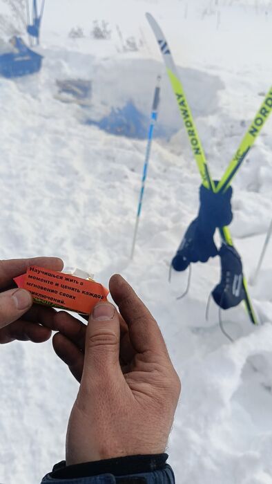 После снегохода дистанцию проходили волонтёры на лыжах. Им предстояло разместить маркировочные ленты и таблички с описаниями мест этого края и местных животных, указанием пройдённых километров и мотивирующими надписями.