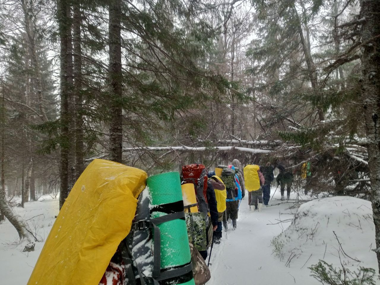 - Мы ожидали небольшой дождь и были готовы к различным осадкам, но не в такой степени. На одном из первых кордонов мы попали под небольшой дождь, из-за которого сместили восхождение. И в эту же ночь выпало большое количество снега и не прекращаясь бушевала вьюга. Выбрав подходящий период времени в затишье пурги, мы решили выходить на тропу, потому что ждать улучшения погоды в тот момент смысла не было. Несмотря на непогоду, мы получили огромное количество положительных эмоций от красоты заснеженного леса и шутили, что попали в несколько сезонов за один поход, - поделился с нами впечатлениями Вадим Иванов.