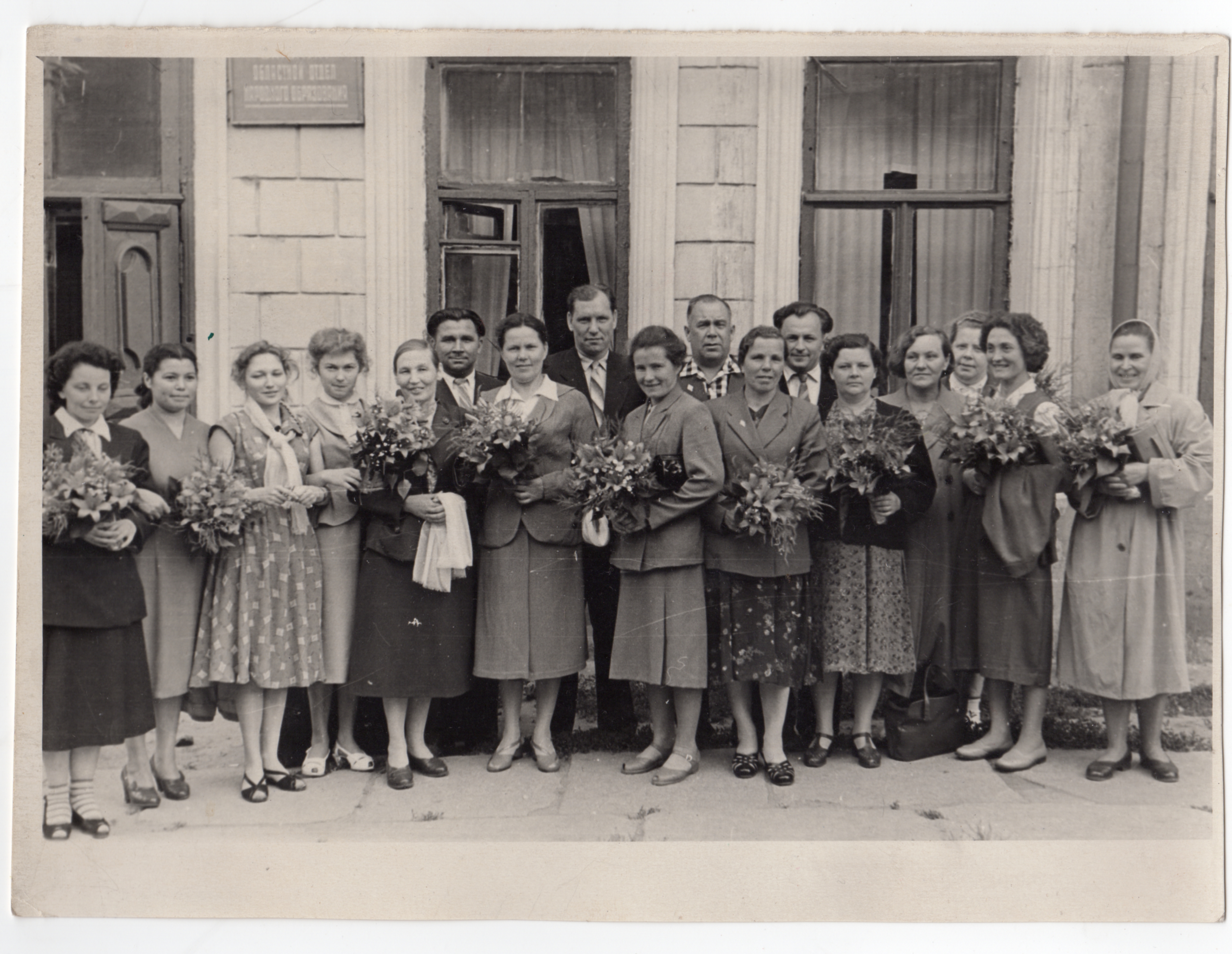 Коллективное фото возле здания Омского областного отдела народного образования участников Всероссийского съезда учителей перед отправкой в Москву, 1960 г. Источник: Омский музей просвещения/goskatalog