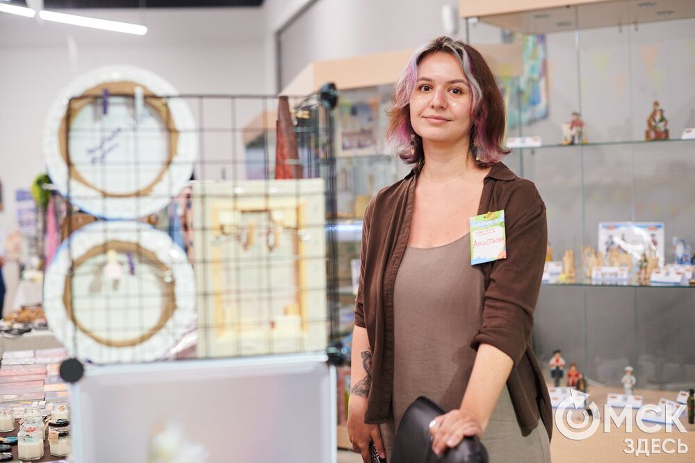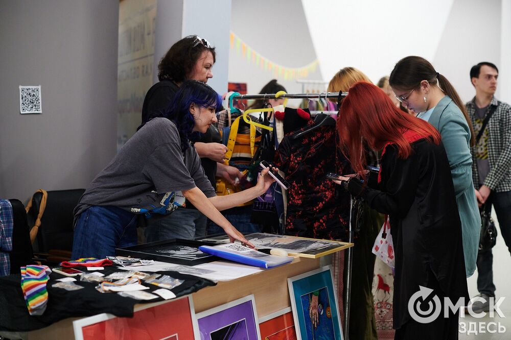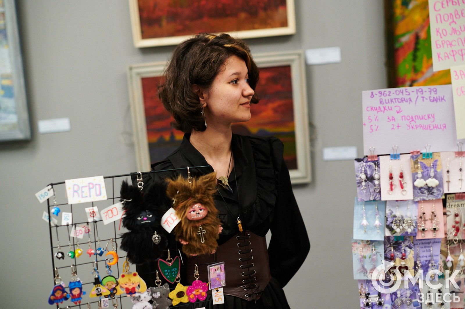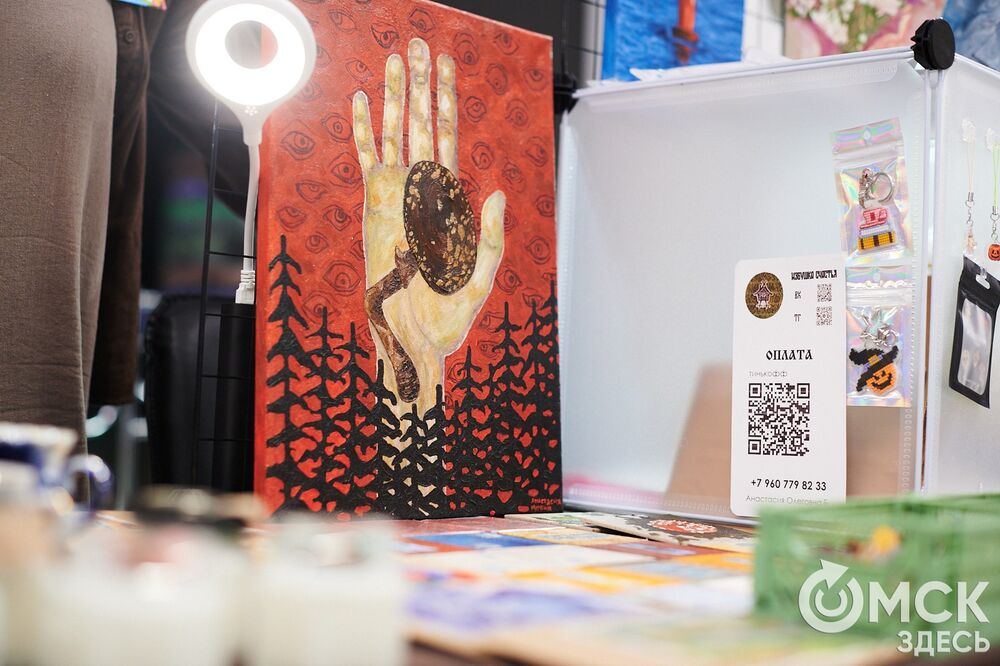 - Я художник из Новосибирска. У нас тоже есть "Гаражка", но в Омск я приезжаю, в первую очередь, из-за людей. Омичи - очень открытые люди, радостные, и мы друг другу подходим по тематикам. Все, кто приходит ко мне, любят интересные истории, а я через свои товары рассказываю какую-либо историю. В моём бренде присутствует немного славянская хтонь и болотная тематика. Омичи, на удивление, всё это любят, поэтому я каждый раз это привожу специально для них. У нас семейный бренд: я пишу картины, делаю открытки, наклейки, мама заливает свечи, а бабушка вышивает. Это то, чем мы любим заниматься. Топ-3 самых популярных товаров у меня такой: первое место - открытки и стикерпаки, второе - свечи в винтажных чашечках, третье - картины, потому что люди любят современное искусство.