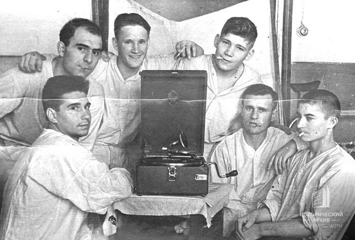 Один из омских госпиталей. Выздоравливающие бойцы слушают патефон.