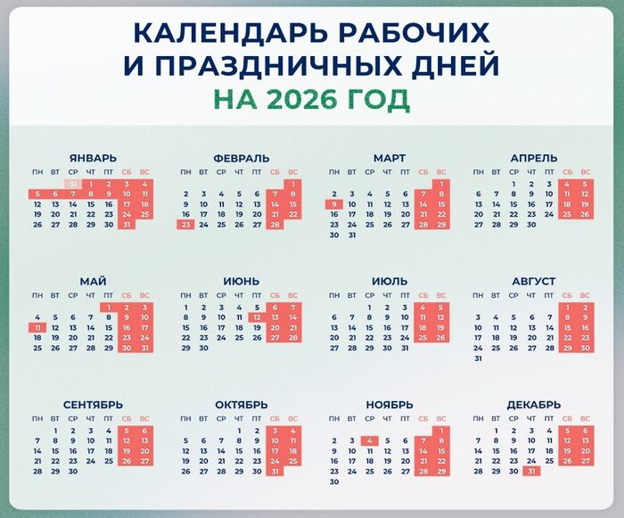 В России готовят календарь праздничных и выходных дней на 2026 год. Его проект сегодня опубликовало Министерство труда и соцзащиты России. Ведомство ежегодно решает, куда перенести дополнительные выходные, если государственные праздники выпадают на субботу или воскресенье. Перенос осуществляется таким образом, чтобы оптимально распределить время труда и отдыха, по возможности объединить праздничные и выходные дни.