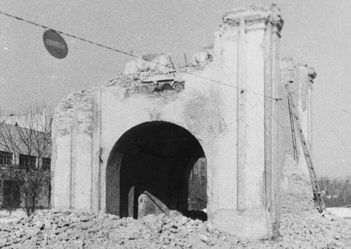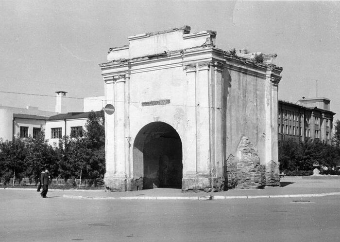 Тарские ворота в 1900-е, 1950-е и в день сноса, 17 февраля 1959 года. Источник: И. П. Дрейлинг (автор копии), К. А. Савина, И. И. Липовский (ОГИК музей/goskatalog.ru)