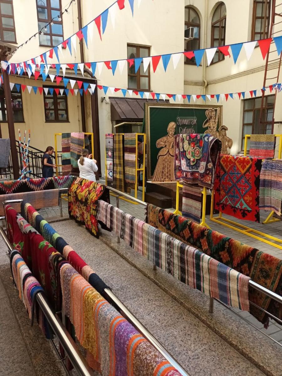 Яркие краски заполнили внутренний дворик Центра "Эрмитаж-Сибирь". Однако глобальная "сушка" не связана с дождливой погодой. Всё дело в том, что каждый год в летние дни хранитель фонда народного искусства занимается просушиванием предметов из текстиля.