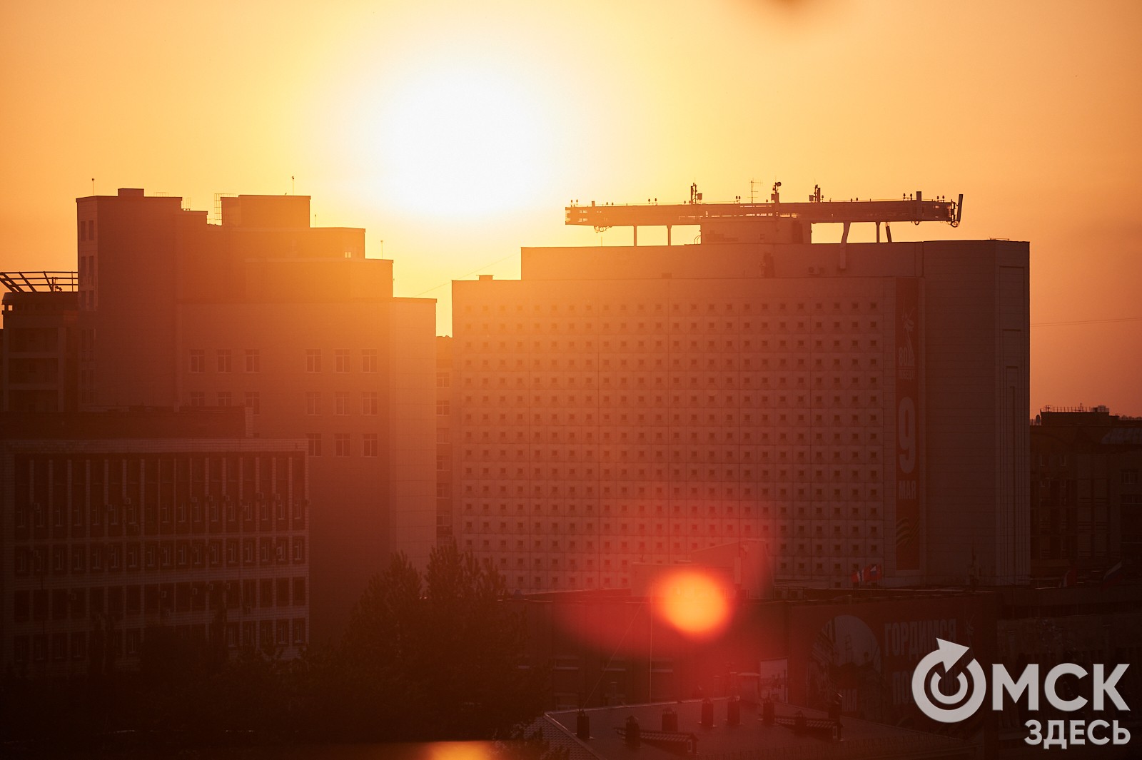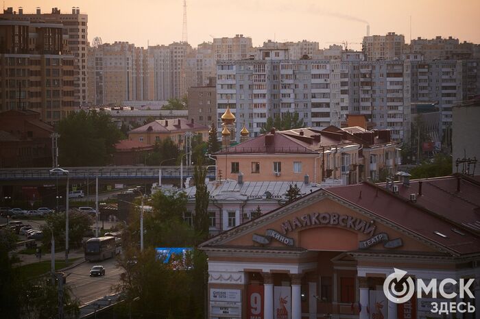 Зелёные крыши Омской драмы, "трамплин" Музыкального театра, одна из башен Сакена и Кафедральный собор Воздвижения Креста Господня, который, как и Успенский, стоит у бывшего тракта на Тару - ул. Тарской