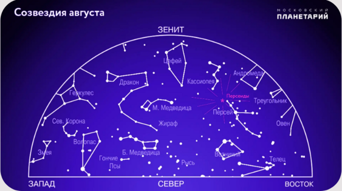 Август - традиционное время для ярчайшего "звёздного дождя". Метеорный поток Персеиды можно наблюдать в Северном полушарии весь месяц. Но есть период, когда он набирает свой максимум и в атмосфере Земли сгорает до 100 метеоров в час. Зенит ожидается в ночь на 12 августа (около 2:00 по омскому времени), и в течение трёх-четырёх суток около этой даты Персеиды просматриваются лучше всего. Для наблюдения выбирайте время с полуночи до рассвета и направляйте свой взор на северо-восточный горизонт.