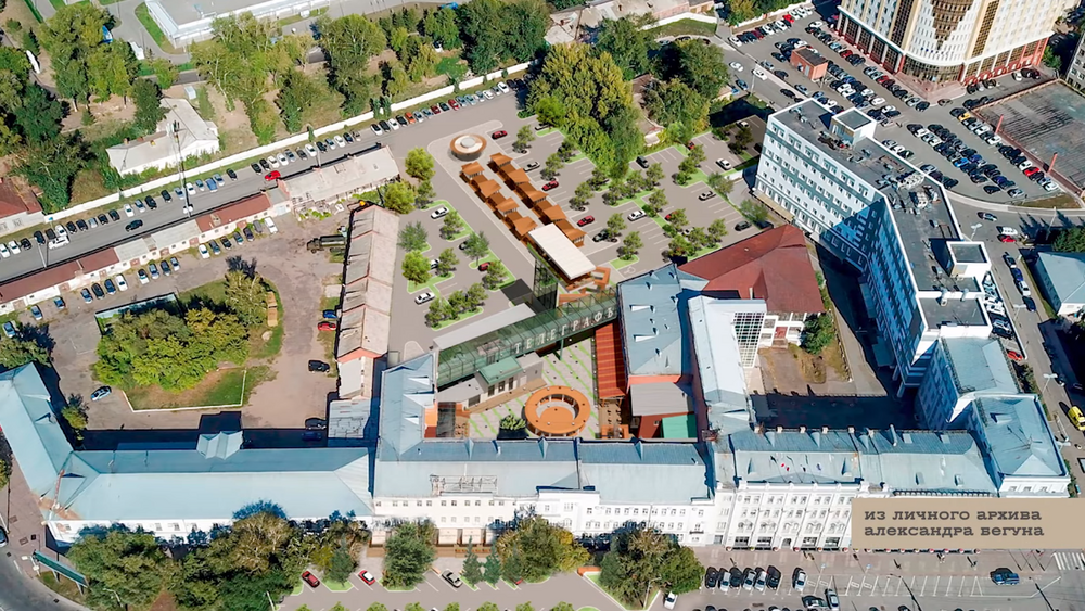 Рядом находятся и другие исторические объекты с установленными зонами охраны, которыми вводятся ограничения на работы: здание интендантства 1859 года (Гагарина, 38), занимавшегося снабжением вооружённых сил, здание торговой фирмы 1914-1916 годов, или Русско-Азиатский банк (Гагарина, 34), в котором теперь располагается мэрия. Внутренний двор, образуемый ими, понемногу оживает, в основном за счёт общепита. И здесь же находится флигель первой городской больницы (Больничный переулок, 13), с которой в 1778 начиналось омское гражданское здравоохранение (а через дорогу, кстати, - старейший омский госпиталь, где лечился Фёдор Достоевский). На его месте, судя по предоставленному проекту, изображено высотное здание.