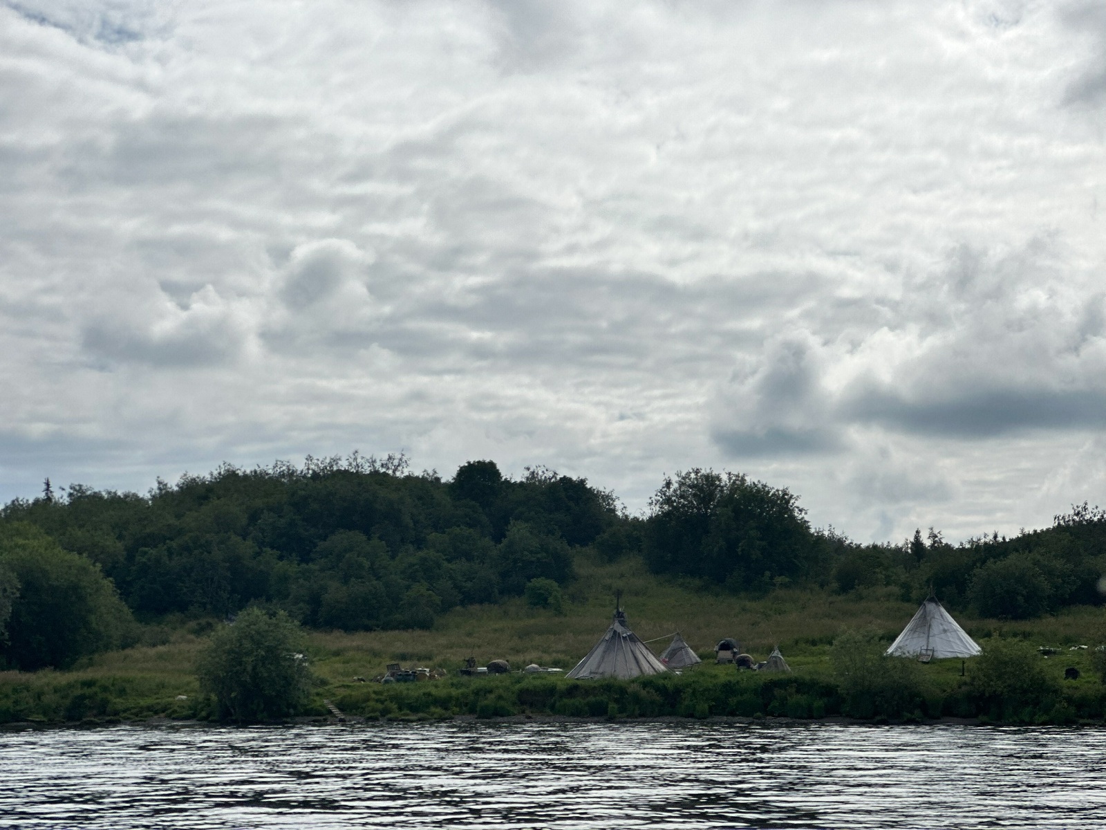 - Проходя вдоль берега, я заметил белые пятна на зелёном полотне леса. Это оказались чумы, рядом ходили люди и что-то делали, тут же стояли хакасские или ненецкие сани, нарты. Я порадовался и одновременно удивился тому, что так далеко от городов кто-то сделал реконструкцию жизни коренных народов. Значит, и тут туризм потихоньку просыпается… Думая об этом, я поплыл дальше, и через десяток километров меня догнала мысль: "Какая реконструкция?!!! Никто не будет посреди тундры строить бутафорию, тут даже дорог нет!". Позже то, что я видел жилища коренных народов этих местах, мне подтвердил встретившийся на реке рыбак.