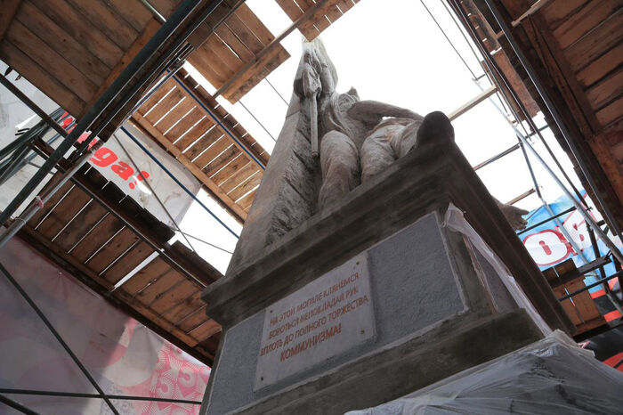 Что касается одноимённого памятника со стороны ул. Ленина, то в рамках технического обслуживания устраняются трещины в бетоне, ржавчина. Завершающим этапом станет напыление для защиты от осадков. По данным департамента культуры, скульптор Николай Виноградов создавал работу прямо на месте: сначала был изготовлен проволочный каркас, на который накладывалась бетонная смесь. Реставрацию необходимо окончить до 28 августа. Ожидается, что после "санации" ремонт не потребуется ближайшие 50 лет.