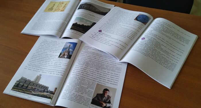 Также на страницах учебника просматриваются Любинский проспект, который и в прошлом, и сегодня считается одним из главных променадов Омска, пожарная каланча, омская Пушкинка.
