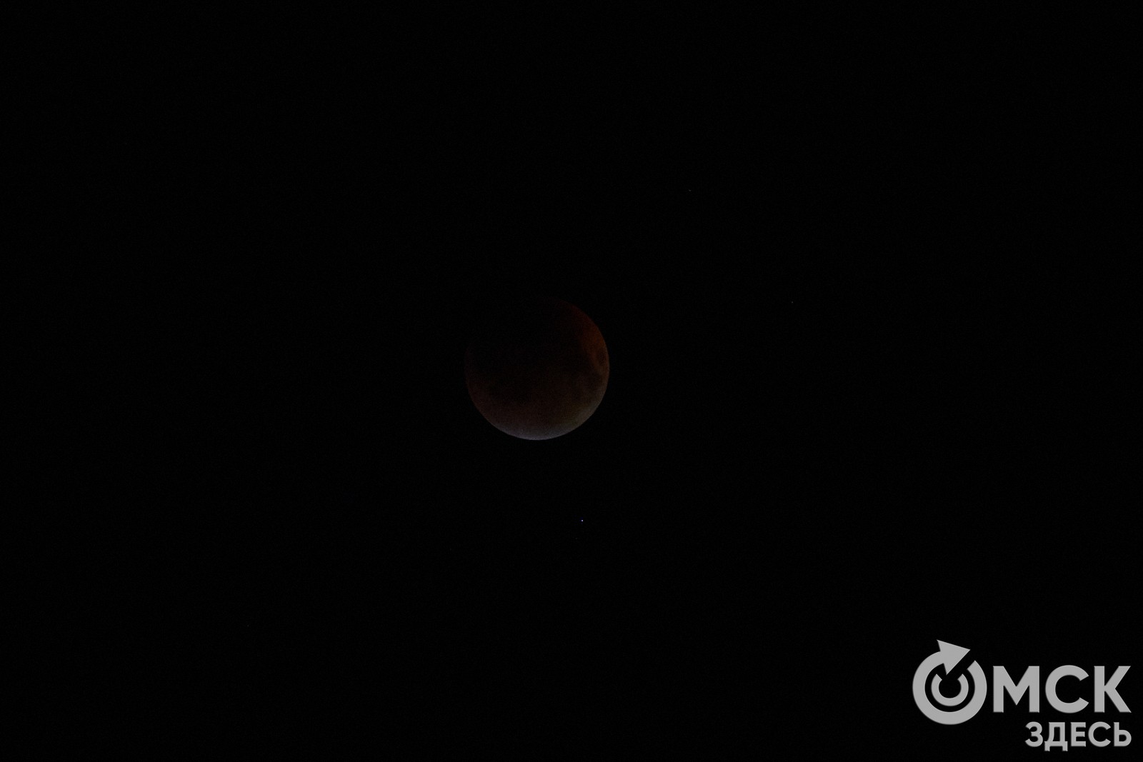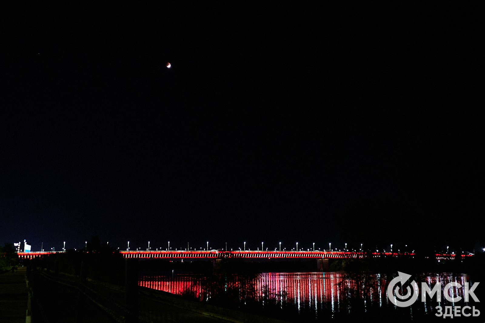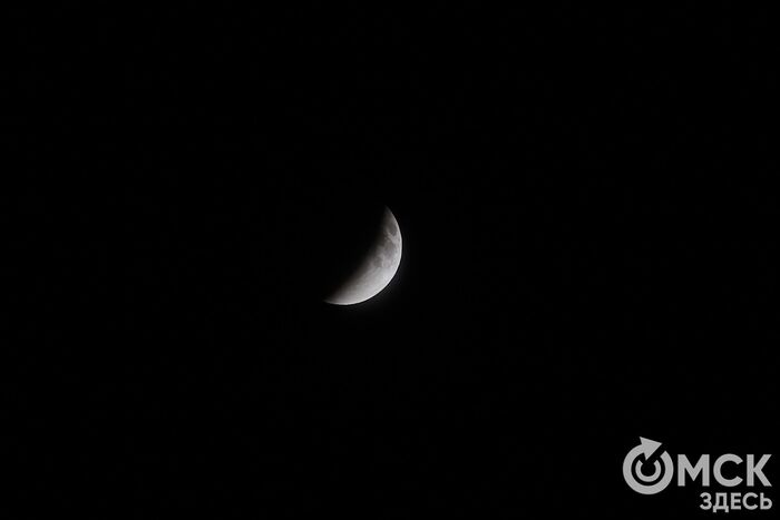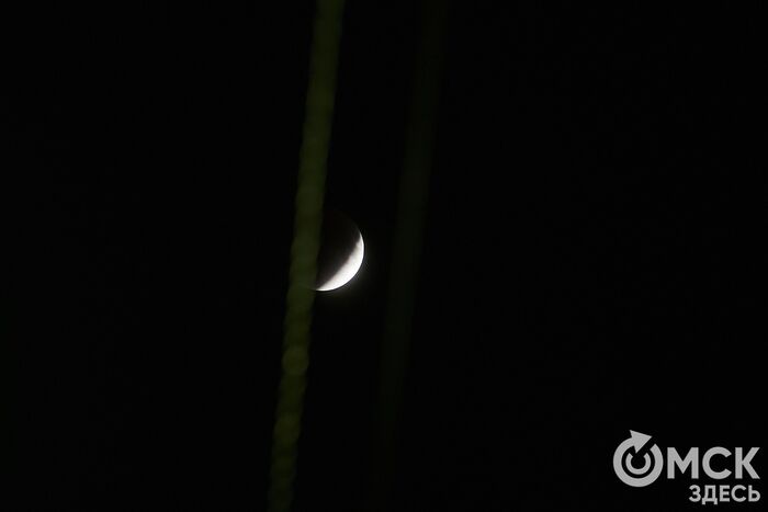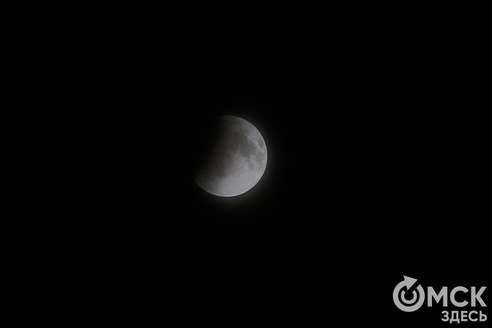 "Представление" началось "по расписанию". По расчётам астрономов, в 21:26 по омскому времени Луна вошла в полутень от Земли, ещё через час - в тень, и стало ясно видно, как будто кто-то "отъедает" поверхность спутника.