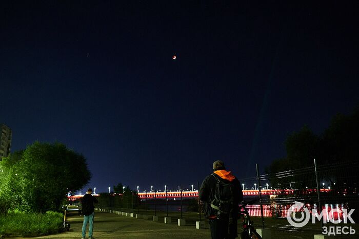 С 23:30 до 00:53 длилась полная фаза затмения с минимальной яркостью Луны, еле заметной на небосводе. Происходящее ловила в объектив телефона пожилая местная жительница, вышедшая на прогулку, ещё один фотограф, случайный велосипедист.