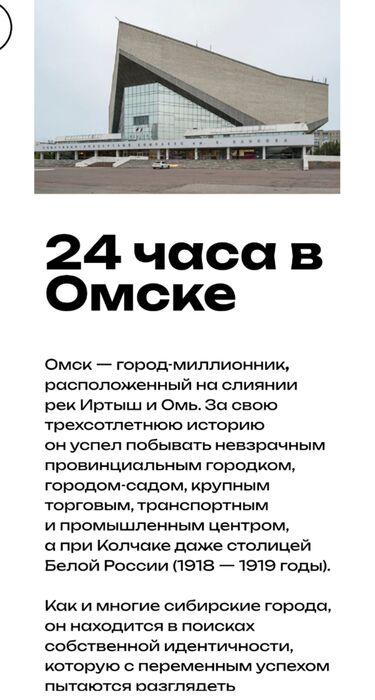 Маршрут "24 часа в Омске" проложен по центральной части городе. Для туриста, оказавшегося здесь всего на день, логично прогуляться именно по главным улицам. При этом акцент сделан не на растиражированные достопримечательности, а места, которые придают мегаполису новые смыслы. В гиде нет музея им. Врубеля или Драмтеатра, зато есть районы улиц Труда и Серова, которые транслируют городские легенды и отражают различные архитектурные стили застройки разных лет. Также путеводитель знакомит приезжих с уютными дворами, деревянной синагогой, галереями, Городским музеем "Искусство Омска", магазином локальных товаров и др.