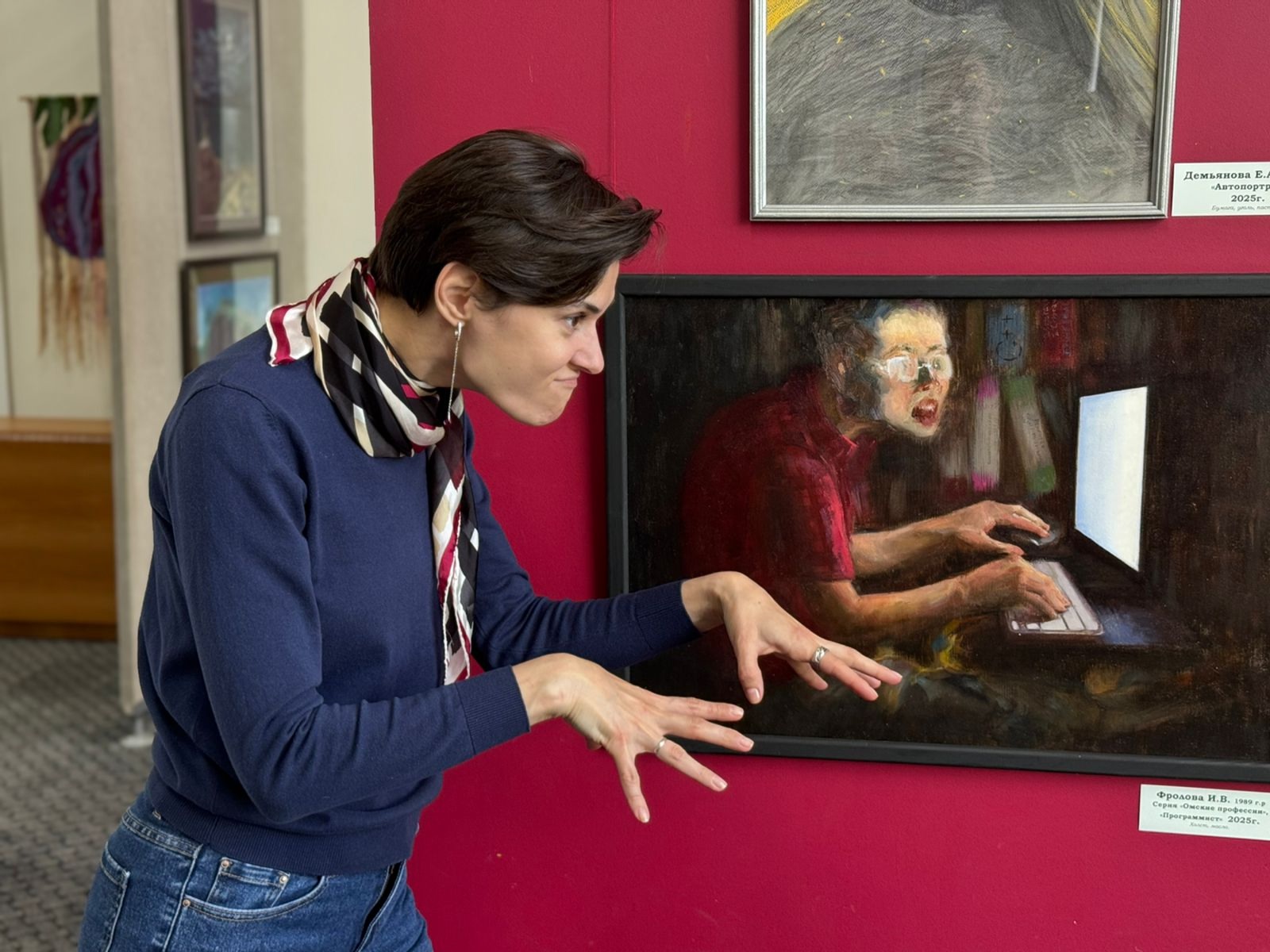 Прогуливаясь среди картин во время акции "Ночь музеев", выставленных в Доме художника, мы набрели на работу омской художницы Ирины Фроловой "Программист" (2025 год). Оказалось, что на холсте отражены многие стереотипы и мифы о разработчиках: замкнутые люди, которые всё время ходят в свитере, очках и небритые, не разгибаясь, целыми днями сидят за компом и с дикой скоростью что-то печатают. Ирина Фролова пояснила, что при создании картины начинающих художников учат: в произведении должны быть "китч, кринж и клюква". Когда она думала, кто бы мог подойти под критерии трёх "к" для работы на выставку, родилась картина "Программист". А мы спросили самих разработчиков, насколько образ на холсте соответствует реальности.
