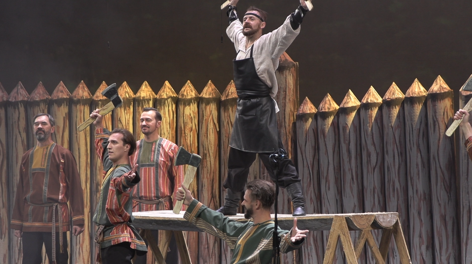 - Нам за антракт пришлось сделать демонтаж и монтаж практически новому спектаклю. У нас же было объединено две разных программы, как я уже говорила. Это показатель того, как коллектив может мобилизоваться, потому что это всё мы делали своими силами. Все конструкции, которые выкатывали и закатывали, собирались. И это делали сами артисты хора. Понятно, что они не первый раз это делали, у них есть опыт. В туре мы показывали лишь один блок программы, а в Ярославле, перед Кремлём, решили представить сразу два отделения. Это помогло артистам не только понять свои физические возможности, но и почувствовать тайминг на монтаж "Тарского острога". Это очень серьёзные декорации: они двухэтажные, их нужно закреплять, по ним передвигаются артисты, ворота должны открываться - то есть это всё должно быть выверено за короткое время. Поэтому тут надо и декорации подготовить, и костюмы поменять, собственно, и всё это нужно сделать за антракт. Это достаточно большая техническая сложность, которую наши артисты преодолели с большим успехом.