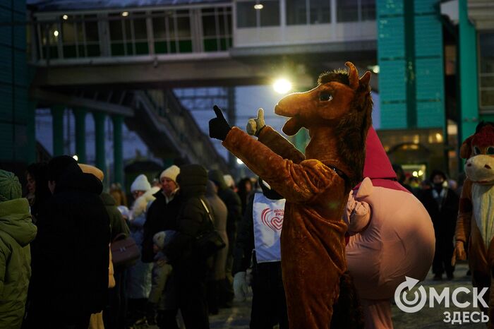 Первыми к омичам вышли помощники морозного чародея - Гном, Снеговик и Зайчики. Спустя несколько мгновений на платформе появилась Снегурочка, а затем и сам Дед Мороз.