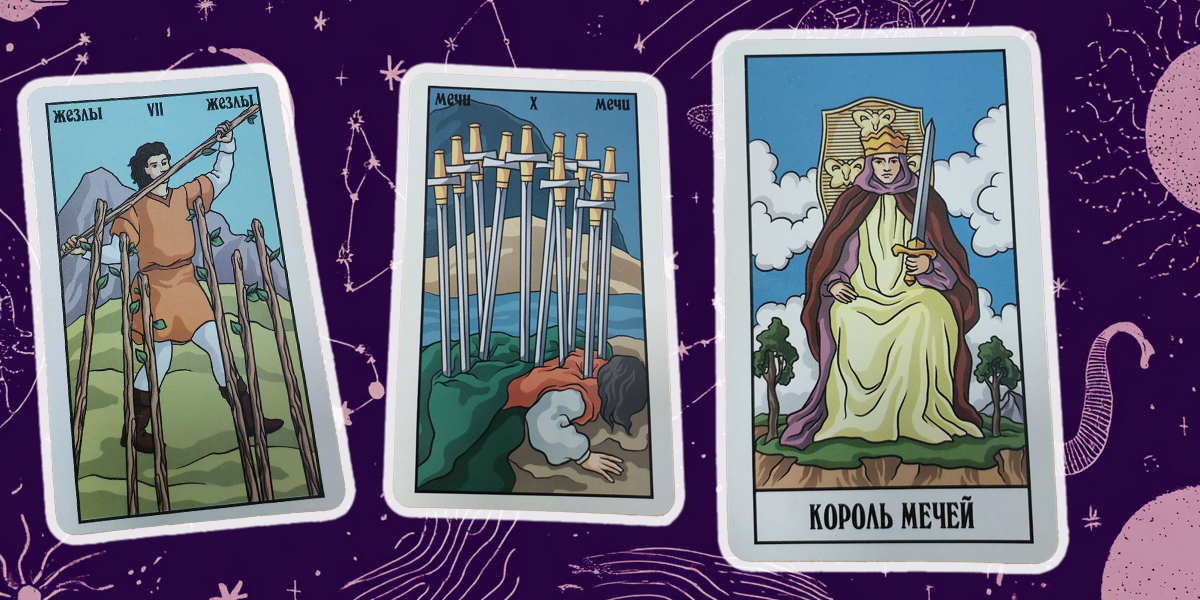 "Десятка мечей", "Рыцарь жезлов", "Десятка кубков". Сразу говорим: мы вам сочувствуем (ладно, шутим). Десяточки - это всегда про завершение очень важного цикла в жизни. Стрельцам понадобится тазик для слёз - переживать расставание с прошлым вы будете тяжело. Скорее всего, Стрельцы примут фальшивое счастье за истинное, пойдут по пути наименьшего сопротивления и решат, что яркая картинка важнее сути. Но всё рухнет, и это в итоге ранит представителей знака.