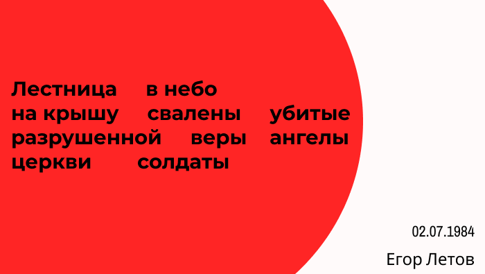 На этот раз перед профессором стояла задача рассмотреть и, главное, осмыслить хотя бы некоторые особенности художественного мира Егора Летова. Произведения рассматриваются как бы изнутри. Например, раздел "Тексты" открывает стихотворение "Лестница в небо". Оно существует только в печатном виде и считается визуальной поэзией музыканта. Произведение можно читать как по горизонтали, так и по вертикали. И нельзя сказать, какое из чтений будет правильным. Именно на таком синтезе, по мнению автора, и формируется смысл стиха.