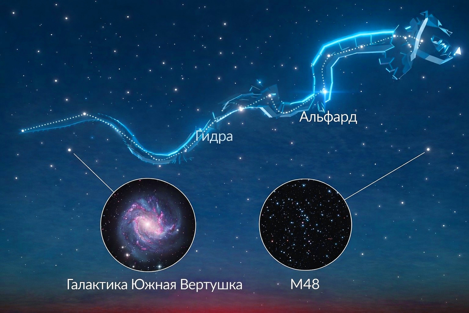 Гидра занимает большую область неба рядом с небесным экватором. Хотя это самое большое созвездие из всех 88, его бывает непросто найти, потому что в нём мало ярких звёзд. На небесных картах Гидру обычно изображают как длинную извивающуюся водяную змею. Поскольку созвездие занимает такую большую область неба, все его составляющие поднимаются над горизонтом очень долго, и увидеть его целиком может быть непросто. Чтобы отыскать астрономическую змею, необходимо начинать с поисков звёзды Альфарда. Она самая яркая, и её часто можно увидеть даже из мест с сильной засветкой.