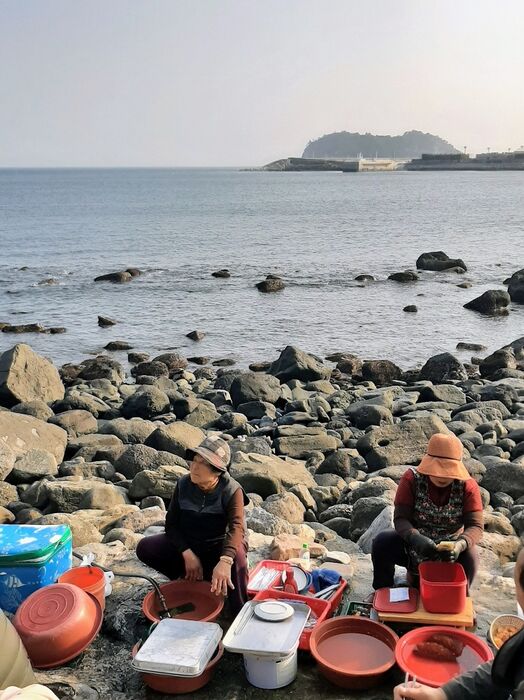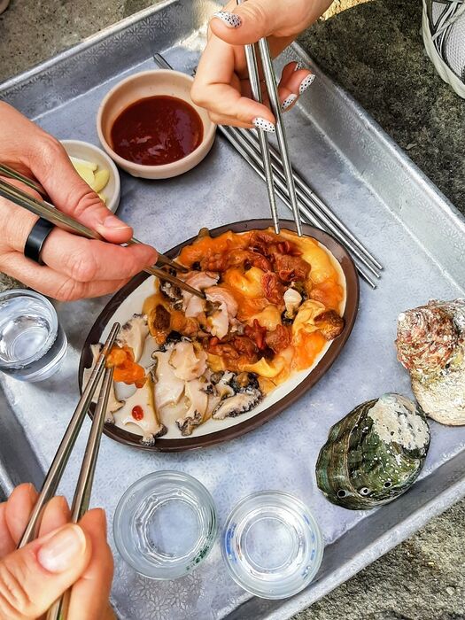 - Очень много морепродуктов там! Я попробовала такие, которых раньше в глаза не видела. Но это тоже на любителя. Самое, наверное, экзотическое, что мы там ели, - это морские гады у бабушек-ныряльщиц (хэнё). Их можно встретить на острове Чеджудо. Они без использования аквалангов добывают моллюсков и другие деликатесы с морского дна. Обычно они работают на глубине около пяти-шести метров, но самые опытные могут опускаться и на 30 метров, задерживая дыхание на две-три минуты. А потом сидят на берегу и всё, что наловили, продают. Хэнё - уникальное явление, вымирающий профессия. Самой взрослой ныряльщице 106 лет, и она до сих пор добывает моллюсков. И этих моллюсков прямо на берегу тебе режут и подают со всякими острыми соусами. Можно, сидя на камушке, смотря вдаль океана палочками есть только что выловленное оттуда моллюска. Интересный опыт, конечно, не стала бы я его повторять, если честно. В плане того, что я и не любитель такой еды.