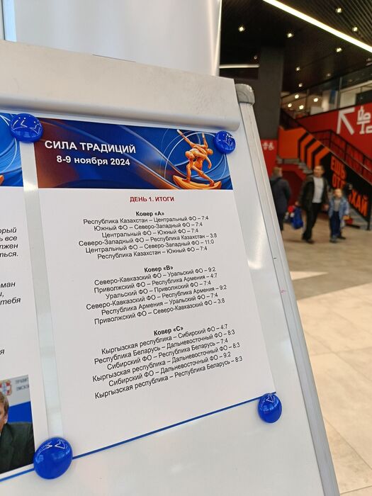 Первый игровой день на турнире начался с сенсации - сборная Казахстана была сильнее действующего чемпиона "Силы традиций" команды Центрального федерального округа, а затем одержала ещё две победы, уверенно выйдя в полуфинал на ковре "А". На ковре "В" три победы из трёх в матчевых встречах добыла команда Северо-Кавказского округа, а на ковре "С" - сборная Сибирского федерального округа, которую особенно горячо поддерживали болельщики.