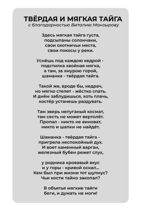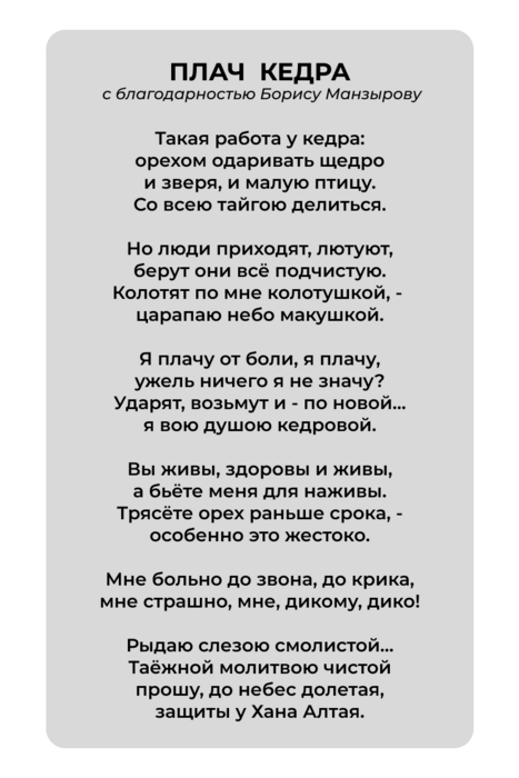 Другой теленгит попросил прямо: "Напиши, Вероника, как кедры плачут! Мы их трясём, колотушкой бьём по ним, а они плачут… но орехи-то надо собирать". Я в тот же день пишу "Плач кедра". И про Пазырыкские курганы, разрытые и разграбленные, мне своё мнение алтайцы высказывали.